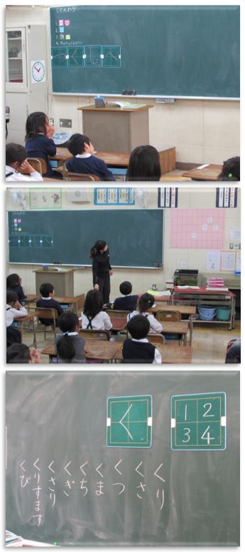 1年生の国語の学習です。ひらがなの学習が始まりました。「つ」「く」「し」「へ」と、学習しました。学習した字が増えると、とてもうれしいですね。