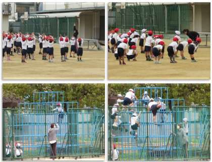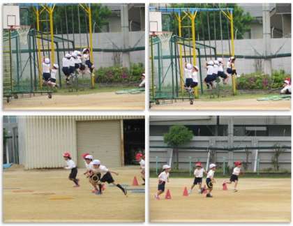 初めに、しっかりと準備運動をします(画像1段目)。続いて、ジャングルジムに登ったり(画像2段目)、のぼり棒にぶら下がる運動をしたりしました(画像3段目)。走って、コーンを回ってくる運動にも、取り組みました(画像4段目)。