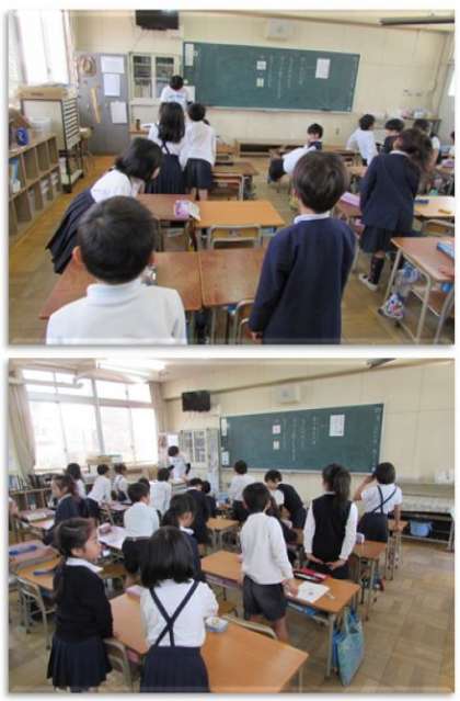 4月27日(木) 朝の挨拶の後、健康調べをしています。「○○さん」「元気です!」