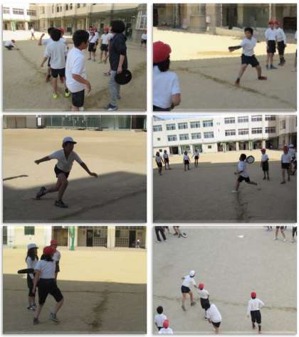 5年生の体育の学習の様子をご紹介します。運動場に出て、ドッジビーをしました。ドッジビーはボールの代わりにディスクを投げる、ドッジボールと似たゲームです。ボールと違い、離れた相手を狙って投げるのはなかなか難しいようです。