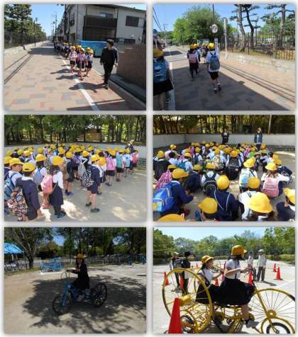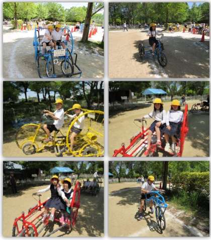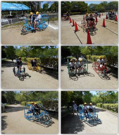 公園では、クラスごとに分かれ、自転車博物館と自転車ひろばに行きました。自転車ひろばでは、さまざまなタイプのクラシック自転車のレプリカに乗りました。自転車の形も乗り方も様々で、子どもたちは漕ぐのに苦労していましたが、次第に慣れ、たくさんの自転車に乗ることができました。