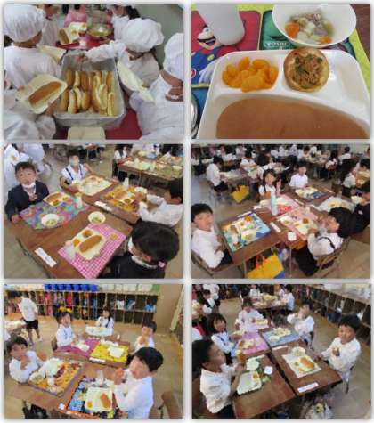 本日の給食の献立をご紹介します。本日の献立は、コッペパン、マーマレード、豚肉と野菜のスープ煮、かわりピザ、みかんの缶詰、牛乳でした。