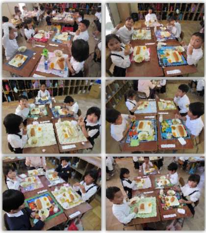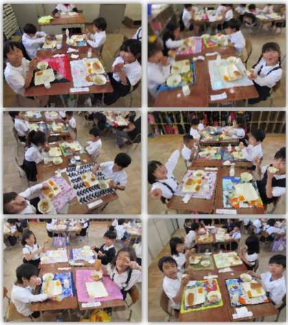 画像は、おいしく給食をいただく1年生の様子です。