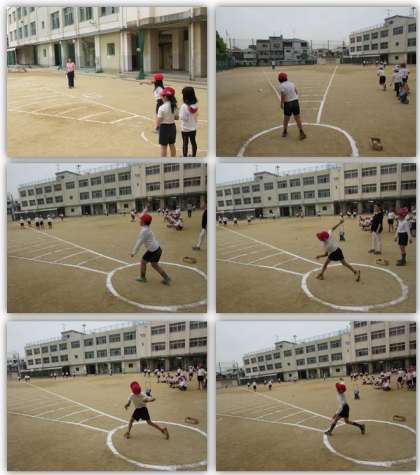2時間目は、3年生です。ソフトボール投げは、3年生から6年生までが行います。3年生の子どもたちにとって、初めてのソフトボール投げの計測ですが、結構腕をしならせて力強く投げている子もいました。