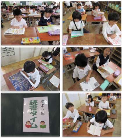 画像は、2年生の読書タイムの様子です。子どもたちは、各自が選んだ本を、じっくりと読んでいます。