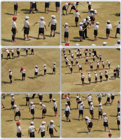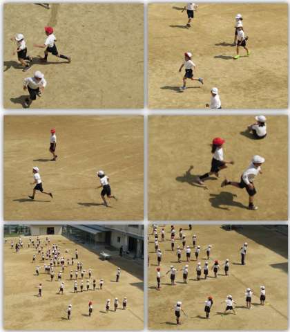 2年生の体育の様子です。初めに、おにごっこをしました(1〜2段目)。