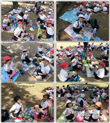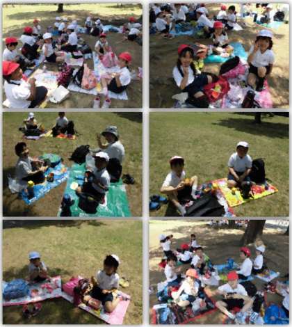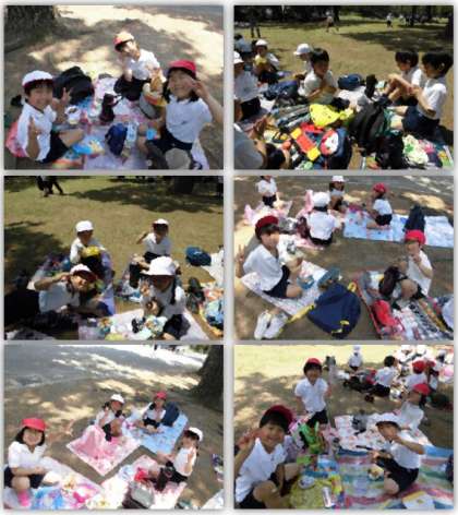 お昼になり、芝生の上、木陰に入って、お弁当を食べました。友達と一緒に食べるお弁当は、とてもおいしかったです。