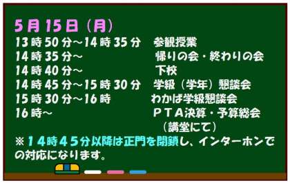 5月15日(月)、参観授業・懇談会を実施いたします。ご多忙とは存じますが、多数の皆様のご参会をお待ちしております。