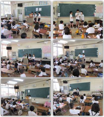 毎月、第2・4・5週目の金曜日の朝は、図書委員会による1・2年生への紙芝居の読み聞かせがあります。読む図書委員も、少し緊張気味のようです。1年生、2年生の子どもたちは、熱心に聞き入っています。