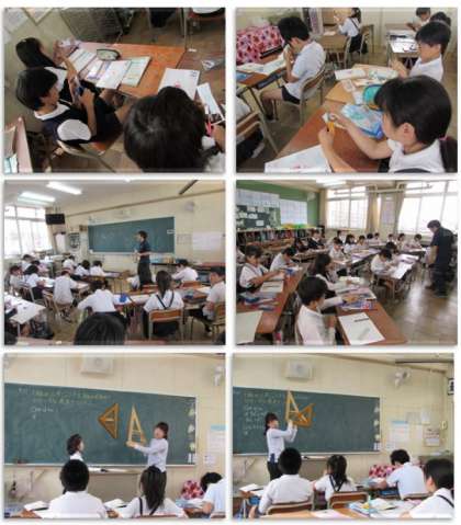 4年生の算数の学習です。三角定規の角を組み合わせて、いろいろな角度をつくる課題に取り組みました。子どもたちは、三角定規を合わせる(くっつける)とたし算で、重ねるとひき算で角度を求められることに気付きました。