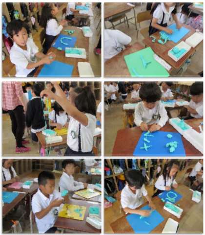 1年生の図画工作の学習です。粘土を細く細く伸ばして、自分の名前を粘土板の上に作りました。ひらがなだけでなく、漢字で作った子や、アルファベットの「A」を作って見せてくれた子もいました。