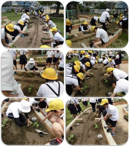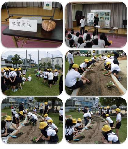 勝間南瓜のふるさとは、西成区玉出(旧勝間村)とされる、小型で縦溝とこぶのある、粘質の日本かぼちゃです。今日はその勝間南瓜の苗を、5年生の子どもたちが学習園に植えました。