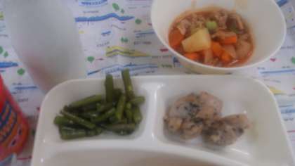 本日の献立は、黒糖パン、鶏肉のバジル焼き、ケチャップ煮、三度豆のソテー、牛乳でした。