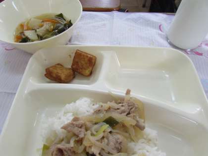 本日の献立は、豚丼、五目汁、厚揚げのしょうがじょうゆかけ、牛乳でした。