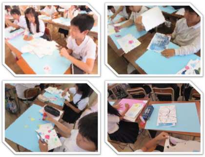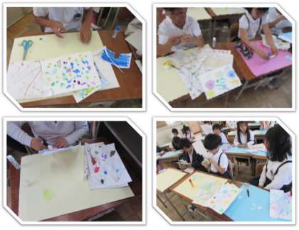4年生の図画工作の学習です。滲みやストローでの吹き流しなどの絵の具の効果を使って彩色した紙を、色画用紙に貼りつけています。