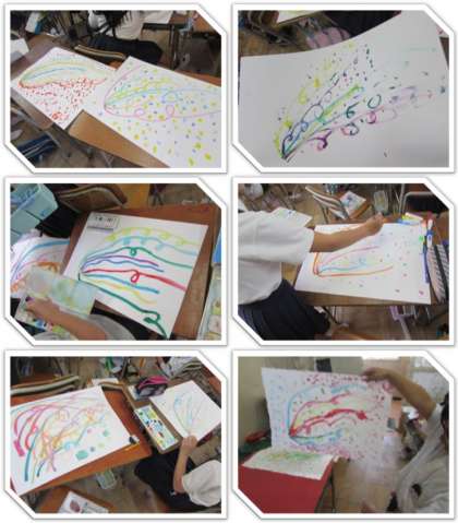 3年生の図画工作です。先日作ったクラッカーから、どんなものが飛び出すと楽しいか、考え、画用紙に描いていきました。