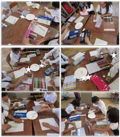 1年生の生活科の学習です。学習園に蒔く種を観察し、カードにかいています。机の上の紙皿に乗っている、緑色の小さな種は何?と尋ねると、「オクラ!」と答えてくれました。
