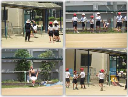 5月22日(月) 4年生の体育です。鉄棒で逆上がりや足かけ上がりの練習に取り組みました。