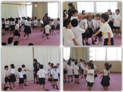 1年生の音楽の学習です。第2音楽室に行き、皆で歌ったり、体を動かしたりしました。画像は「ぞうさんのさんぽ」で楽しく体を動かしているところです。