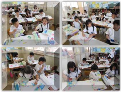 4年生の図画工作です。自分だけの、夢の自転車を考え、描きました。子どもたちは細かい部分にもこだわりを持ち、「これは○○」「ここに、○○がいるねん」と、教えてくれました。