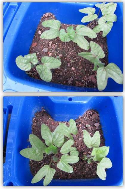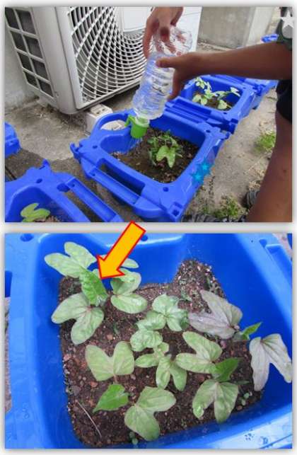 今朝も、登校してきて、朝の学習の準備ができた子から、アサガオの水やりをしています。見てみると、ふた葉の間から、本葉が出ているものもありました。