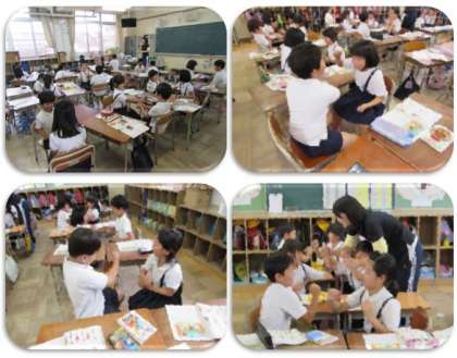 2年生の音楽の学習です。『たぬきのたいこ』に合わせて、ペアでリズム遊びをしています。
