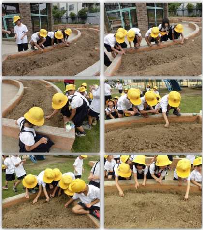 1年生が生活科の学習で、学習園に来ました。学習園に、花や野菜の種を蒔いていきます。マリーゴールドやホウセンカなどの花、オクラなどの野菜の種も蒔きました。これから水やりや草抜きを、子どもたちは頑張ります。