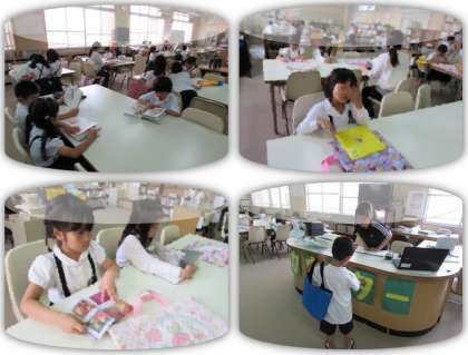 1年生が学校図書館に来ました。読みたい本を選び、カウンターで本を借りたり、返したりしています。