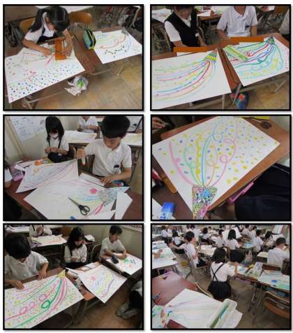 3年生の図画工作です。クラッカーから飛び出す様子を、絵の具で画用紙に大きく表現しました。