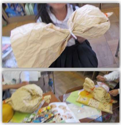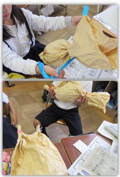 2年生の図画工作の学習です。今日は、紙袋に、丸めた紙などを芯として入れていきました。子どもたちは自分が作りたいものの形に合わせて、芯の量や紙袋のくくり方を工夫しました。