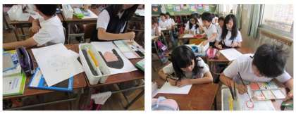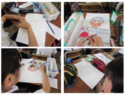6年生の図画工作の学習です。自画像を描いています。鏡を見て、じっくりと観察をし、丁寧に描いていきました。線描を終えた子は、絵の具で彩色していきました。