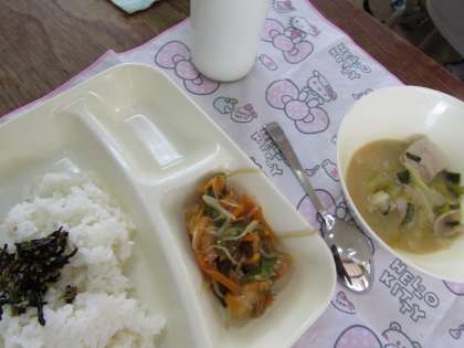 本日の献立は、ご飯、サケの野菜たっぷりあんかけ、味噌汁、まぜまぜふりかけ、牛乳でした。