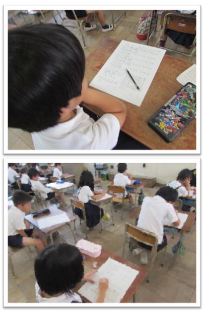 2年生が算数テストに取り組んでいます。今日は、たし算のテストです。