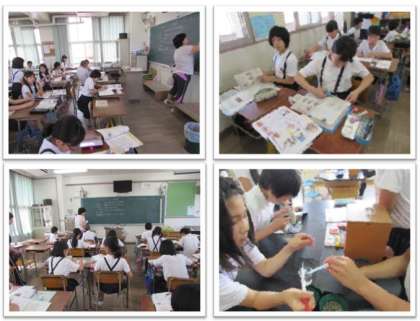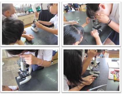 5年生の理科の学習です。教室で、プレパラートの作り方を学習しました。その後、理科室に行って実際に顕微鏡で池の水を観察しました。池の水の中には、ミドリムシがいたようです。