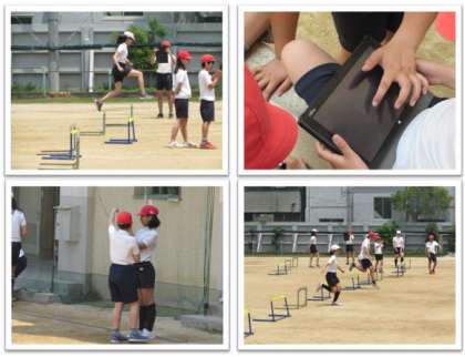 タブレットを持って、運動場に出ました。体育で、ハードルを跳ぶ時の様子を互いに撮影し、各自の跳ぶ姿を確かめました。動画で見ると、自分の課題がすぐに見つけられます。