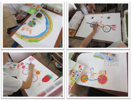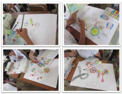 4年生の図画工作です。空想の世界の、不思議な自転車を描いています。