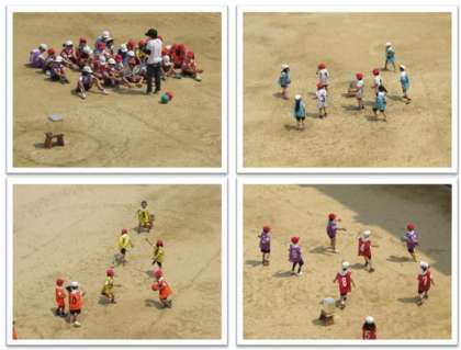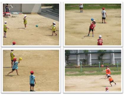 2年生の体育の学習です。初めに、班ごとにボールを投げ、受ける練習をしました。その後、台の上に的を置き、その的にボールを当てたら得点になる、というゲームをしました。