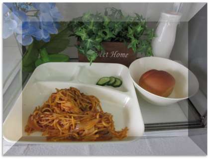 本日の献立は、黒糖パン(小)、スパゲッティミートソース、きゅうりのピクルス、牛乳でした。
