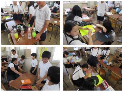 6年生の教室では、千本子ども祭りに向けての準備に取り組んでいました。色のついた水の入ったペットボトルを用意していますが、さて、これは何に?