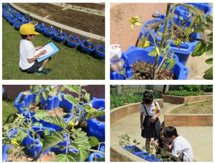 2年生が育てているミニトマトに、黄色の花がつき始めました。子どもたちも、早く実が生らないかな、と楽しみにしています。
