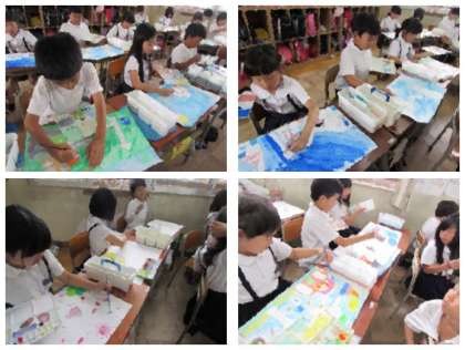 4年生の図画工作です。自分の考えた不思議な自転車を走らせる、不思議な世界を描いています。