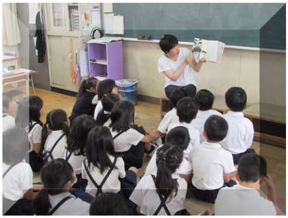 読書タイムには、各自が本を読むだけでなく、先生が本の読み聞かせを行うときもあります。画像は、2年生のクラスの様子です。