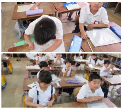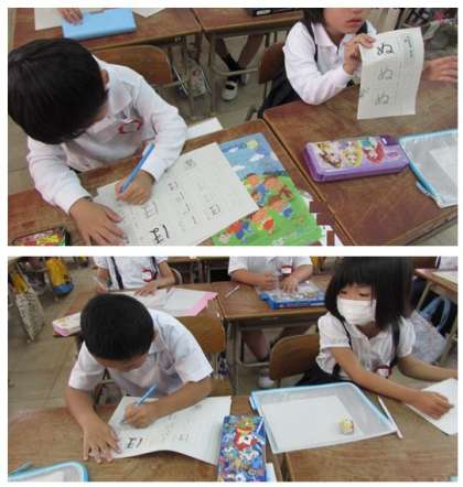 1年生も、毎日、宿題に取り組み、国語や算数の復習に取り組んでいます。画像は、配られたひらがなプリントに名前を書く1年生の子どもたちです。