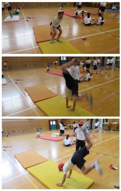 5年生の体育の学習です。体育館で、マット運動を行っています。画像は、側転の練習に取り組んでいるところです。