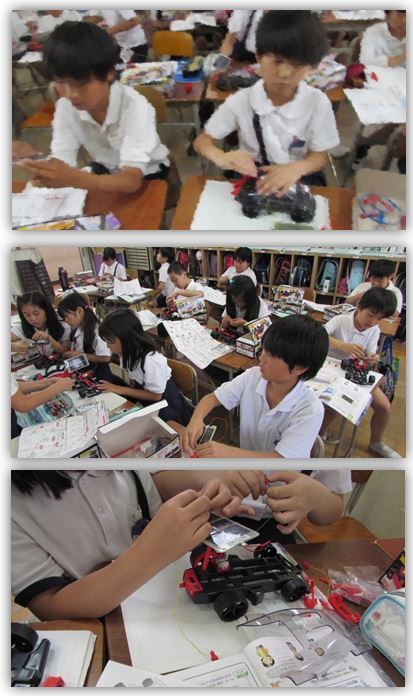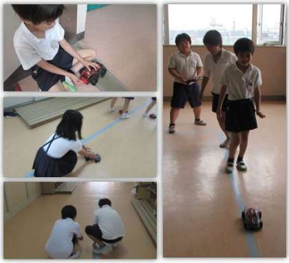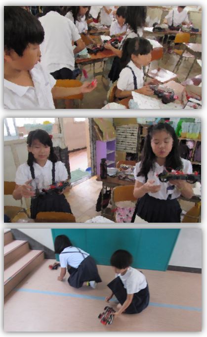 4年生の理科の学習です。今日は1組がモーターカーを組み立て、廊下で走らせてみました。うまくつながって、車が走り出すと、子どもたちは大喜びです。