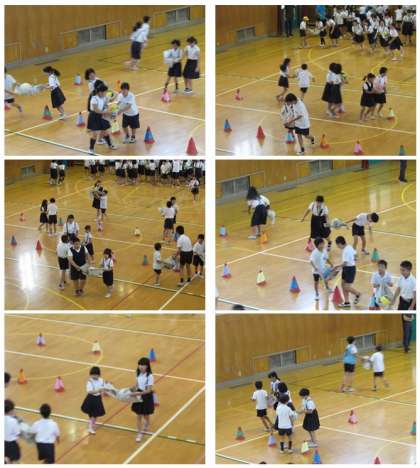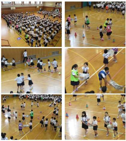 今日の集会は、集会委員会による『新聞紙ボール運びリレー』です。ペアになって、新聞紙を広げて持ち、その上にボールを乗せて運ぶ、という競争です。運んでいるうちに、どんどん新聞紙が破れていくチームもありましたが、子どもたちは力を合わせ、一生懸命に走りました。