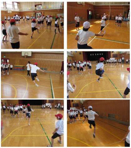 6月8日(木) 4年生の体育です。体育館で、大縄をしています。
