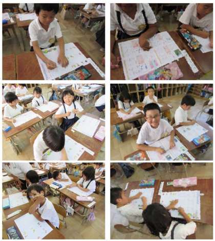 1年生の国語の学習です。ひらがなのワークを使い、書き取り練習を行っています。