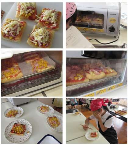 今日は、料理クラブの活動をご紹介します。今日の料理クラブは、「かわりピザ」を作りました。うす揚げを生地に、ケチャップを塗り、細く切ったベーコンや缶詰のコーン、チーズを乗せ、トースターで焼きました。焼きあがったピザは、香ばしく、とてもおいしかったです。