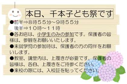 本日、今年度1回目の土曜授業を行います。千本子ども祭を行います。多数の皆様のご参会をお待ちしております。